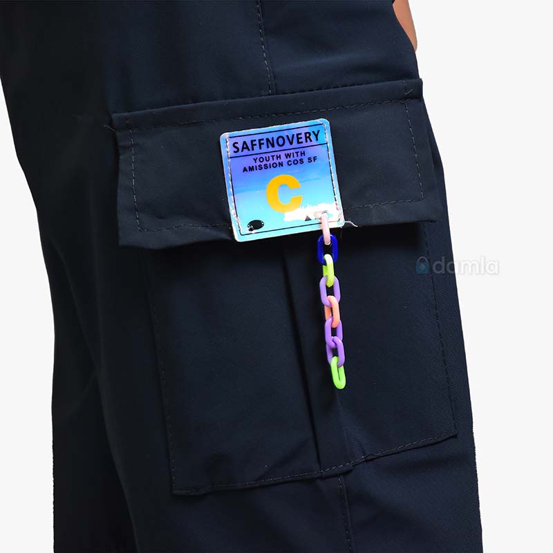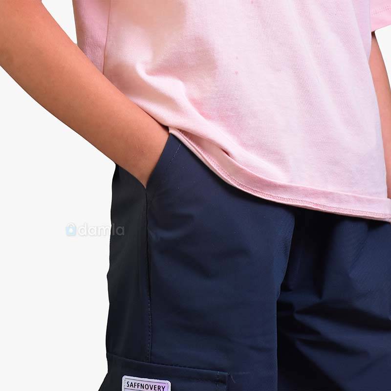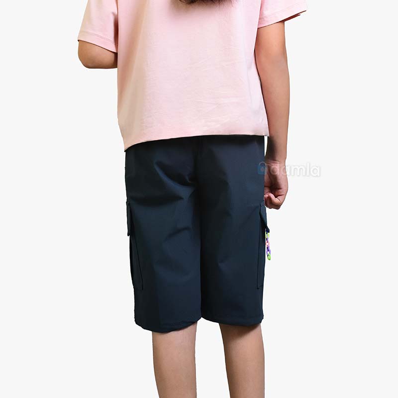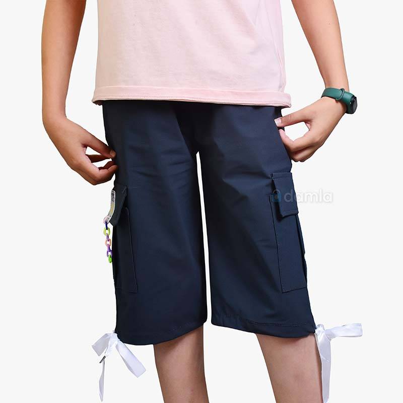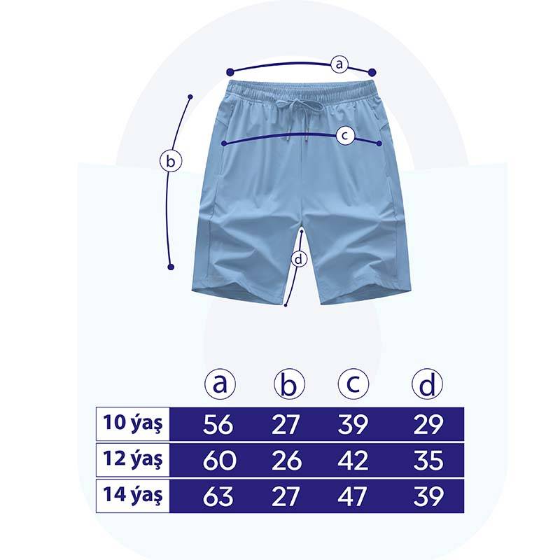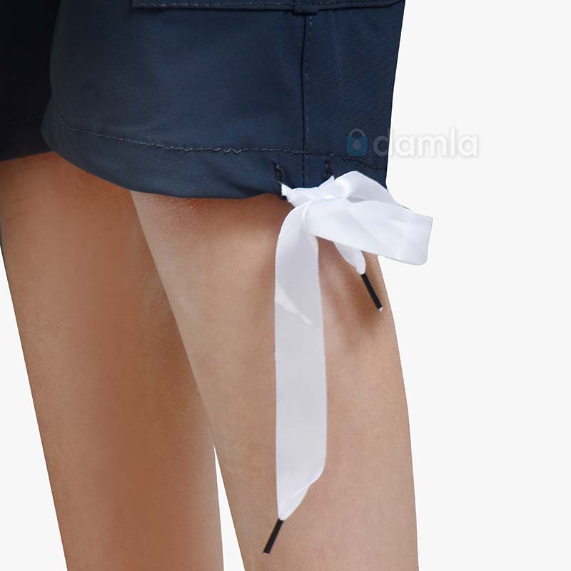 • Aýratynlyklary: Gyz çagalar üçin goýy gök reňkli şortik. Çalt gurayan, ýeňil mata. Bili rezinli we şortigyň aşagynda ak reňkli lenta bilen bezelen. Şortigyň gyrasynda bezelen jübüleri bar. Dynç alyşda, deňizde we öýde gündelik geýmäge bolýan şortik.