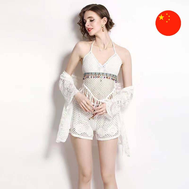 • Aýratynlyklary: Üç bölekden ybarat bu toplum, bitewi we sazlaşykly keşp döretmek üçin ähli zerurlyklary öz içine alýar. Näzik kružewaly nakidka: ýeňil we howa geçirýän bu nakidka owadan gül nagyşlary bilen bezelip, islendik keşbe elegantlyk goşýar. Krop-Top: boýundan daňylýan, örülen görnüşli. Kružewaly Şortik: bili rezinli, daňylýan ýüpli. Ýumşak we ýeňil materiallardan ýasalan bu toplum yssy tomus günleri üçin ideal.