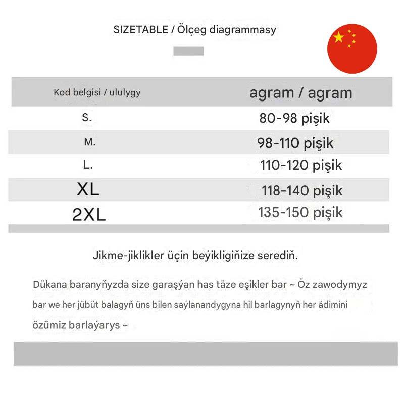 • Aýratynlyklary: Zenanlaryň ak billi kesilen jynslary. Jynsyda gişbolup rahatlygy üpjün edýär. Toplumda tegelek tokly inçejik goňur örülen kemer bar.