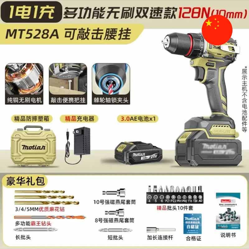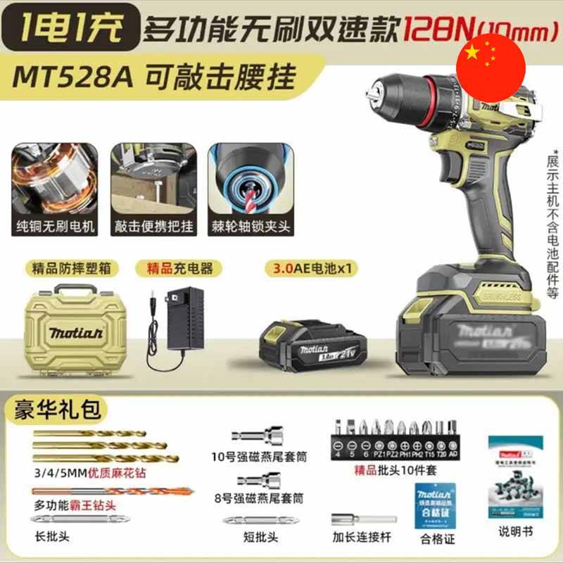 • Aýratynlyklary: Akumulýatorly şurupburgy MT528A - köp funksiýaly, şýotkasyz, iki tizlikli gural. Toplumda "1 gural, 1 akumulýator, 1 zarýad beriji enjam" bar. Iň ýokary aýlaw momenti 128 Nm. Toplumyň içinde: şurupburgy, 3.0 A/s akumulýator, zarýad beriji enjam, bitler toplumy, burawlar we amatly keys bar. Burawlamak we towlamak üçin kämildir.
