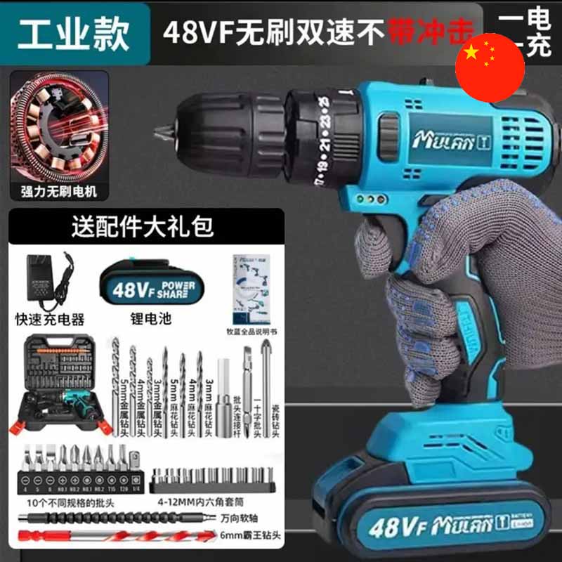 • Aýratynlyklary: Akumulýatorly şurupburgy-drel Mulan 48VF - urgy funksiýasyz, güýçli, şýotkasyz, iki tizlikli gural. Burawlamak we towlamak üçin kämildir. Toplumda: gural, iki sany akumulýator, zarýad beriji enjam we nasadkalaryň, burawlaryň hem-de bitleriň uly toplumy bar. Bu model islendik ýumuş üçin ajaýyp saýlawdyr.