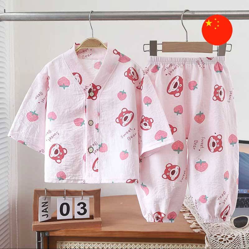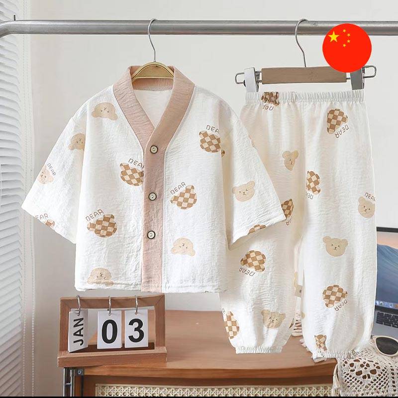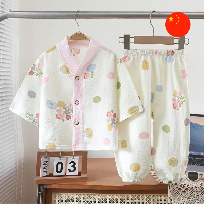 • Aýratynlyklary: Bu ýeňil çagalar eşikler toplumy, yssy günler üçin iň amatly saýlawdyr. Softumşak we dem alýan matalardan ýasalyp, ýakymly çap bilen bezeldi. Toplumda boş V ýakaly köýnek we amatly elastik balak bar.