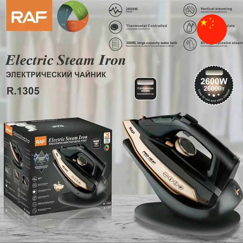 • Aýratynlyklary: 2600 Wt güýji we keramiki padoşy güýji bolan RAF R.1305 elektrik bugly ütük. 350 ml suw çüýşesi we dik bug funksiýasy bilen enjamlaşdyrylan. Ütükde dürli matalar üçin termostat bar, bu täsirli we ýumşak ütüklemegi üpjün edýär.