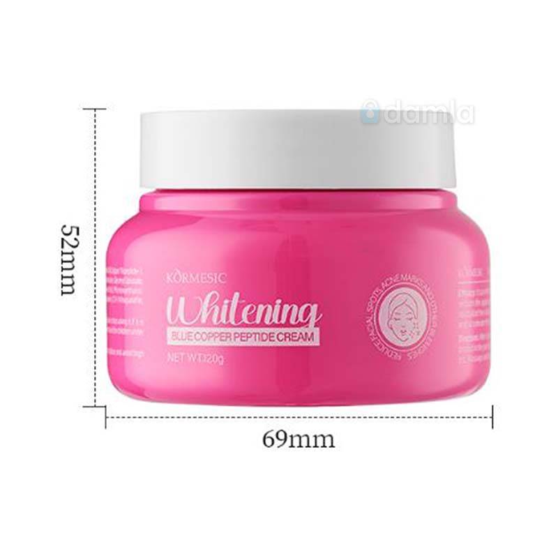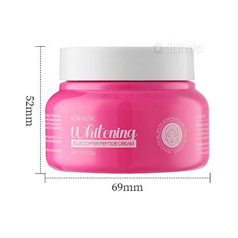 • Aýratynlyklary: Kormesic brendinden ýüz üçin niýetlenen agardyjy krem. Deriniň reňkini açmaga, ýagtyltmaga we deňleşdirmäge kömek edýär. Düzümi "Gök Mis Peptidi" (Blue Copper Peptide) bilen baýlaşdyrylan. Derini agartmak, tegmilleri we düwürtikden soňky yzlary azaltmak üçin krem.