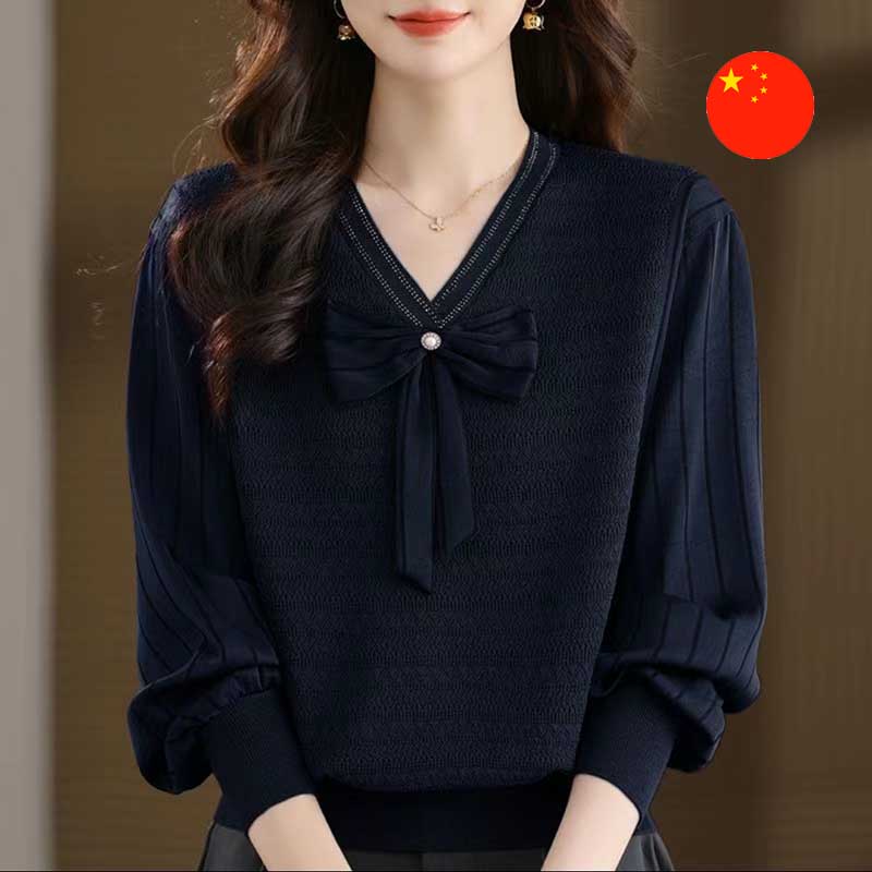 Aýratynlyklary: Çuňňur reňkli sypaýy görnüşli owadan zenan üçin žemper. Onda ýalpyldawuk gyrasy bilen bezelen V-ýakaly ajaýyp dizaýn we merjen bilen uly bantik bar. Elastik gysgyçly çyra ýeňleri modele nepislik goşýar we dokalan mata ony özboluşly edýär.