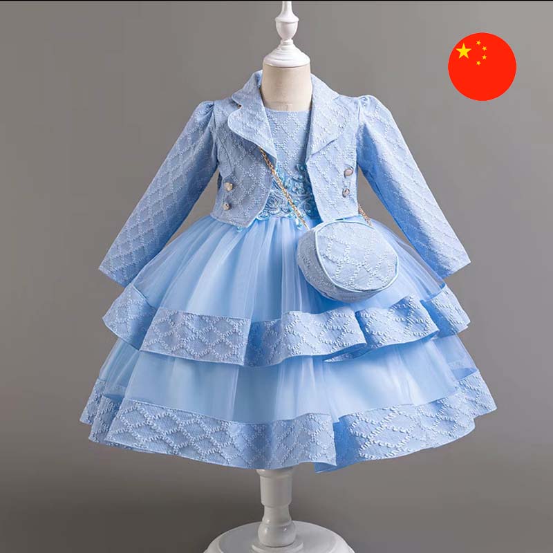 • Aýratynlyklary: Goýy reňkdäki çagalar üçin komlekt. Islendik dabara üçin iň oňat saýlawdyr. Ol köp gatlakly köýnekden, döwrebap gysgaldylan žaketdan we zynjyrly kiçijik sumkadan ybaratdyr. Bu geýim hakyky şa gyzynyň keşbini döredip, örän nepis we kaşaň görkezer.