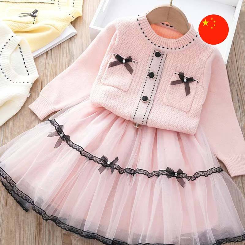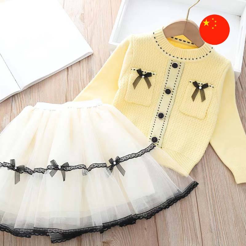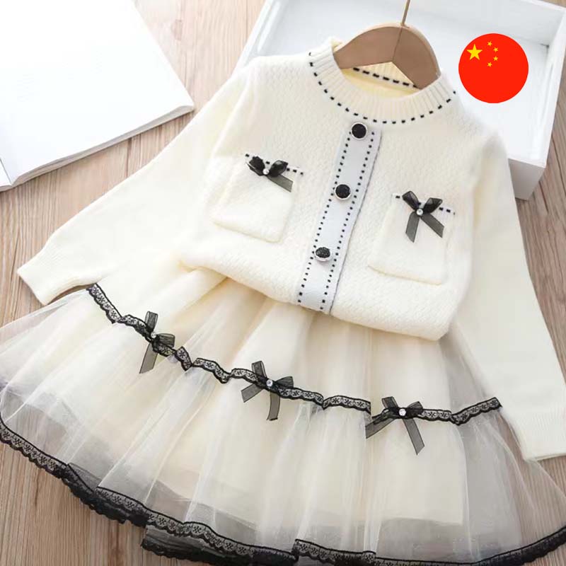• Aýratynlyklary: Baýramçylyk ýa-da fotosessiýa üçin iň oňat saýlaw bolan owadan komplekt eşik. Ol näzik reňkli we ilikli trikotaž kardigandan hem-de köp gatlakly setkaly ýubkadan ybaratdyr. Ýubkadaky we kardigandaky owadan bantiklar nepis we ajaýyp keşbi döredýär.