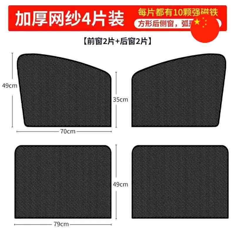 • Aýratynlyklary: Awtoulagyň aýnalary üçin 4 sany galyňlaşdyrylan tor perdeleriniň toplumy, 2 öňki we 2 yzky aýnalar üçin. Her perdedäki 10 sany kuwwatly ýerleşdirilen magnitleriň kömegi bilen berkidilýär. Gün şöhlesinden, ultramelewşe şöhlelerden we nätanyş adamlaryň gözlerinden goraýar.