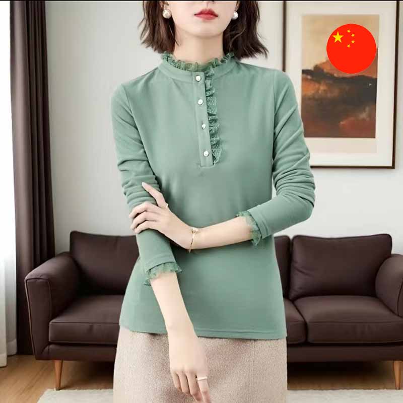 • Aýratynlyklary: Model rahatlygy üpjün edýän ýumşak trikotaž materýallardan ýasalýar. Onuň aýratynlygy, inçejik bürüşikleri we bezegli düwmeleri bar. Dik ýakasy bolsa stilistik aýratynlygy döredýär. Ýeňleriň manjetler hem tolkun görnüşli bezeg bilen bezelendir, bu bolsa keşbe goşmaça owadanlyk berýär.