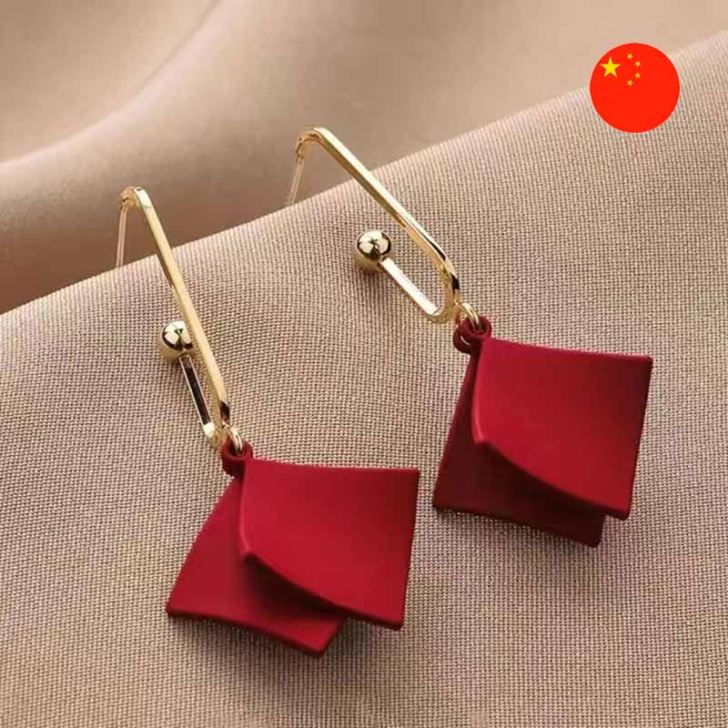 • Aýratynlyklary: Bu goýy gyzyl reňkli iki sany kwadrat plastina, olar edil origami stili boýunça ýygnalan ýaly ýerleşdirilendir. Olar açyk geometriýany gowy görýän we ýüzüne ünsi çekmek isleýänler üçin has amatlydyr. Işewür we dabaraly egin-eşik üçin ajaýyp laýyk geler.
