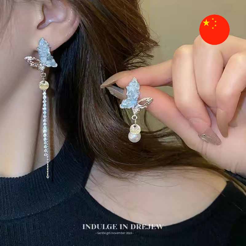 • Aýratynlyklary: Bu gulakhalkalar näzik kebelekleriň, merjeniň we asimmetrik dizaýnyň utgaşmasy bilen aşa romantik we ertekilerdäki ýaly görünýär. Olar ýeňilligini we aýratynlygyny nygtaýar. Her bir gulakhalka kiçijik kebelek bilen bezelen, onuň ganatlary buz ýaly ýalpyldy täsirini döredýän öwüşginli gök ýa-da ýarym dury materialdan ýasalypdyr.