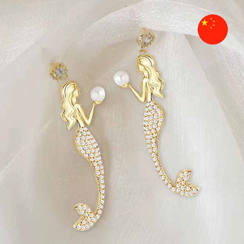 • Aýratynlyklary: Bu gulakhalkalar Mermaid niň owadanaltyn keşbini özünde jemleýär, onuň guýrugy we şekili bütinleýin ýalpyldawuk ak kristallar bilen bezelendir. Ol elinde klassyky täsiri goşýan elegant merjeni tutýar. Bu uzyn, akýan gulakhalkalar boýnuňyzy has uzyn görkezip, ümsi çekýär we agşamky çäreler, dabaralar ýa-da toýlar üçin örän amatlydyr.