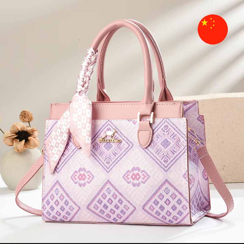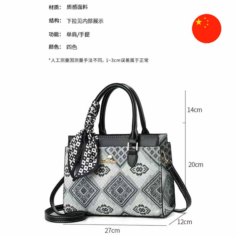 Aýratynlyklary: Bu owadan sumka gündelik ýa-da işewür görnüşi ajaýyp doldurar. Model gurçukly (teksturaly), eliňe ýakymly matadan ýasalan we oňa aýratyn görk berýän özboluşly (original) geometrik nagyş bilen bezelendir. Esbap (Aksessuar) nepis (elegant) ýaglyk (plýatka) bilen bezelendir.