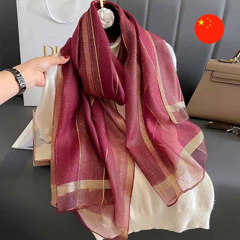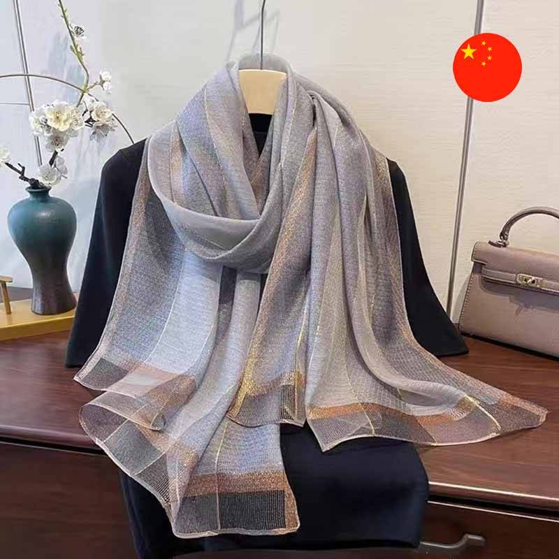 Aýratynlyklary: Gezelençler üçin ýa-da gündelik geýimi janlandyrmak üçin elegant aksesuar. Bu şarf siziň iň gowy saýlawyňyz bolar! Altyn reňkli lýureks goşulan ýeňil mata gözleri özüne çekýän ýalpyldawuk täsiri döredýär. Ol hem agşamky çäreler, hem-de işewür ýa-da gündelik stil üçin gowy saýlaw.