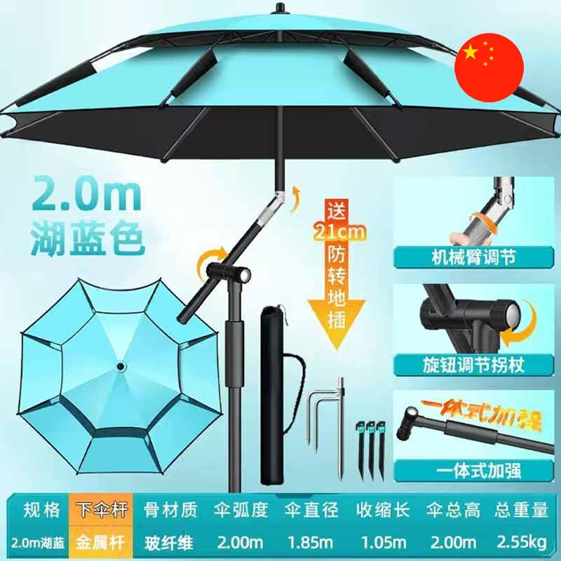• Aýratynlyklary: Mehaniki sazlama (regulirlemek) bilen 2.0 m Professional Balyk tutýan/Kenar üçin Zont. Stersen metal garyndysyndan, spislary bolsa aýna süýüminden (fiberglass) ýasalan, bu bolsa berkligi we ýele çydamlylygy üpjün edýär. Toplumda (komplektde) topraga ynamly (berk) oturtmak üçin güýçlendirilen uzynlaşdyrylan gazyk we ýelden goraýjy berkidijiler (gazyklar) berilýär.