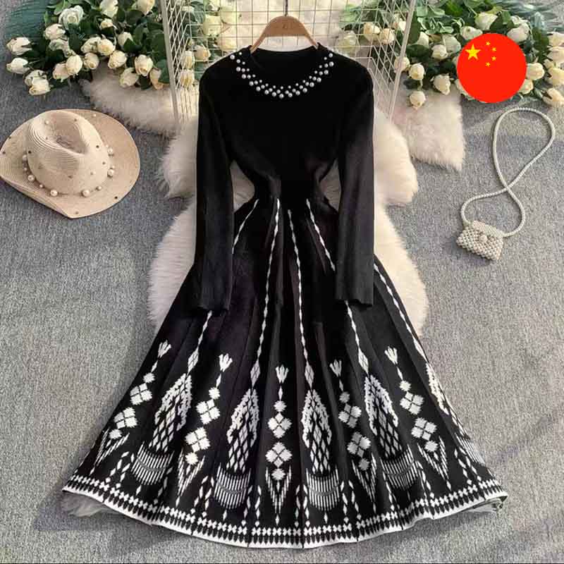 Aýratynlyklary: Ýylylygy we grafiki kaşaňlygy utgaşdyrýan owadan trikotaž midi-köýnek. Klassiki gara fon kontrastly ak nagyşy ajaýyp nygtaýar. Güýzki we gyşky çäreler, ofis üçin 'casual', medeni gezelençler üçin ajaýyp.