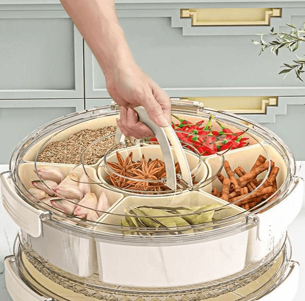 Aşhana üçin 6 bölümli aýlanýan plastik hödürleýiş podnosy: Gapagly, göçme iýmit taýýarlaýyş we saklaýyş gaplary