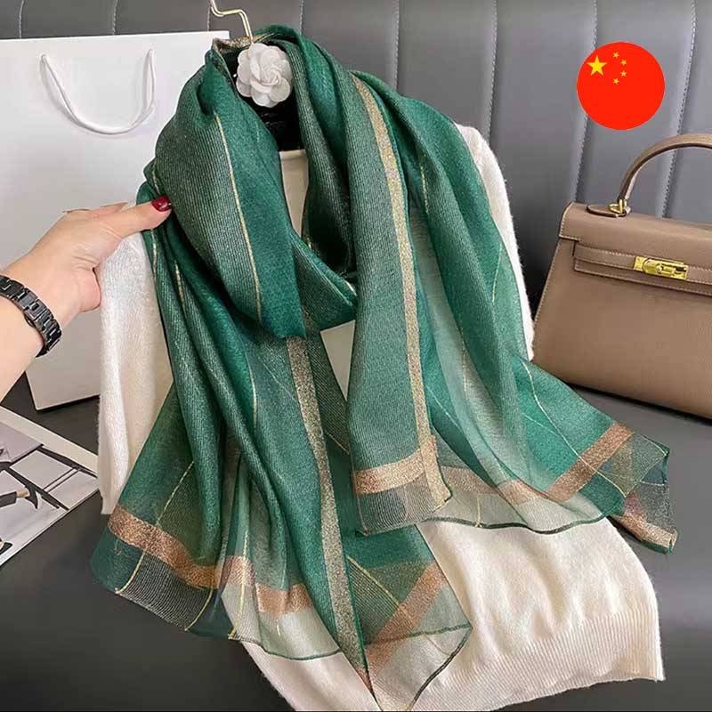 Aýratynlyklary: Ýarym dury, akymly matadan taýýarlanylan owadan aksessuar. Reňk öwüşgininiň inçe ýalpyldaýan sapaklar bilen sazlaşmagy önüme kaşaň görnüş berýär. Onuň dizaýny gyralaryndaky ýyly goňur we çal öwüşginli geometrik nagyşlar bilen baýlaşdyrylan. Şarf ýumşak eplenip, göwrümli we täsirli keşpleri döretmäge mümkinçilik berýär. Bu önüm hem iş duşuşyklary, hem-de dabaraly çäreler üçin örän amatlydyr.