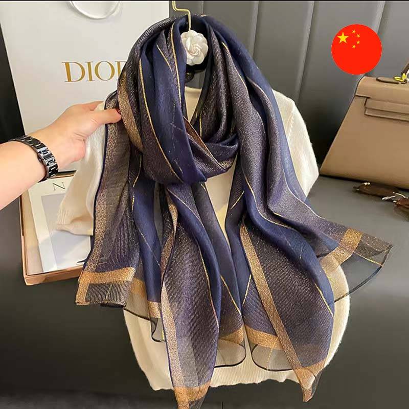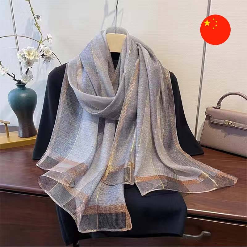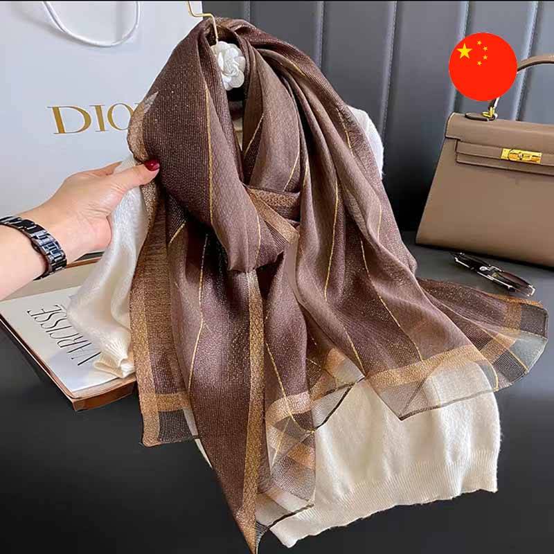 Aýratynlyklary: Ýarym dury, akymly matadan taýýarlanylan owadan aksessuar. Reňk öwüşgininiň inçe ýalpyldaýan sapaklar bilen sazlaşmagy önüme kaşaň görnüş berýär. Onuň dizaýny gyralaryndaky ýyly goňur we çal öwüşginli geometrik nagyşlar bilen baýlaşdyrylan. Şarf ýumşak eplenip, göwrümli we täsirli keşpleri döretmäge mümkinçilik berýär. Bu önüm hem iş duşuşyklary, hem-de dabaraly çäreler üçin örän amatlydyr.