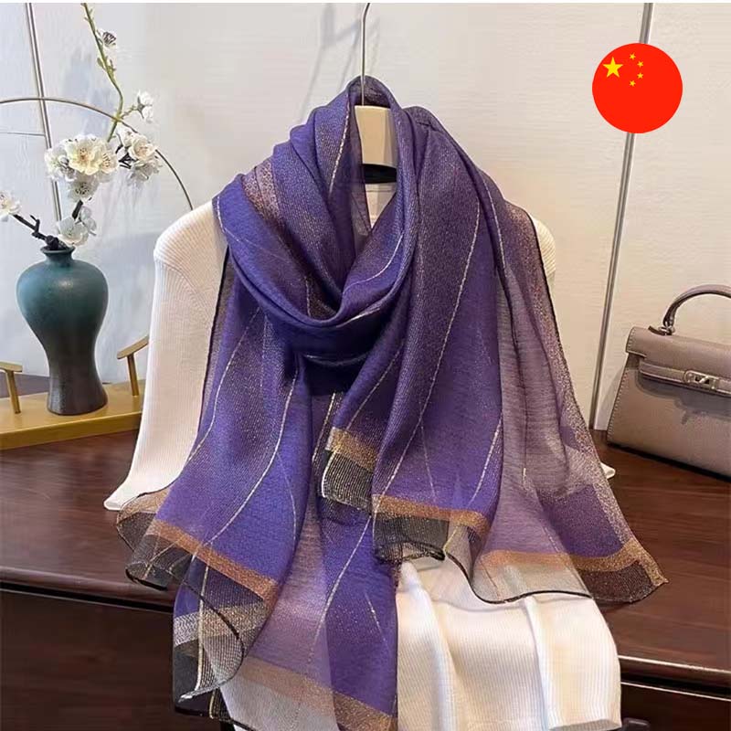 Aýratynlyklary: Ýarym dury, akymly matadan taýýarlanylan owadan aksessuar. Reňk öwüşgininiň inçe ýalpyldaýan sapaklar bilen sazlaşmagy önüme kaşaň görnüş berýär. Onuň dizaýny gyralaryndaky ýyly goňur we çal öwüşginli geometrik nagyşlar bilen baýlaşdyrylan. Şarf ýumşak eplenip, göwrümli we täsirli keşpleri döretmäge mümkinçilik berýär. Bu önüm hem iş duşuşyklary, hem-de dabaraly çäreler üçin örän amatlydyr.