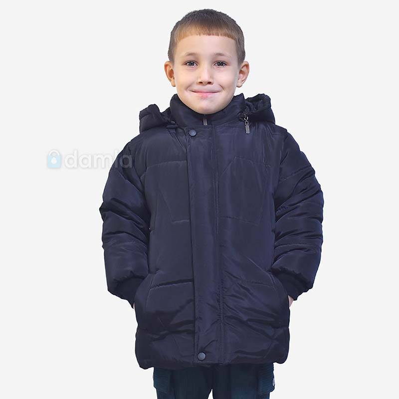 Детская баллоневая куртка чёрного цвета на замке с карманами по бокам и капюшоном для мальчиков. В такой куртке ребёнку будет комфортно и тепло в холодный сезон.