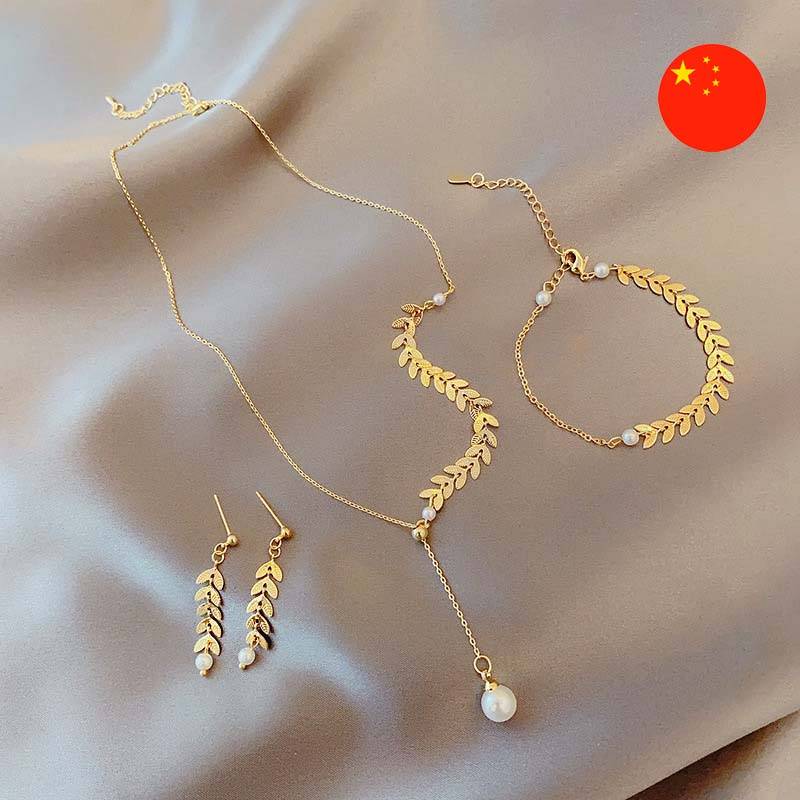 • Характеристики: Нежный и элегантный комплект бижутерии, вдохновленный природными мотивами. Набор включает в себя изящное ожерелье, браслет и серьги-подвески, выполненные в едином стиле. Основной акцент сделан на декоративных элементах в виде золотистых листьев и небольших искусственных жемчужин, которые придают украшениям особую утонченность и шарм. Этот комплект станет прекрасным дополнением к повседневному или праздничному образу, подчеркивая вашу женственность и чувство стиля.