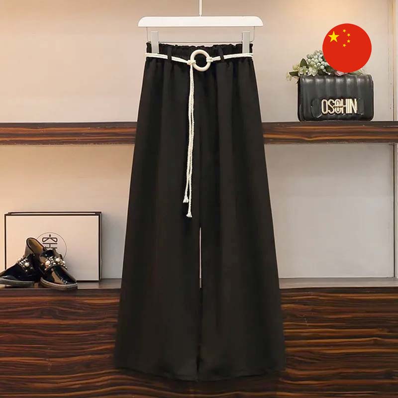 • Особенности: Женские брюки выполнены в классическом черном цвете. Они имеют модный широкий крой по всей длине и высокую посадку, которая визуально удлиняет ноги и делает силуэт стройнее. Отличительной деталью является контрастный белый плетеный ремень с круглым металлическим кольцом, который подчеркивает талию. Эти брюки идеально подходят для создания как повседневных, так и более формальных образов, обеспечивая комфорт и стиль.