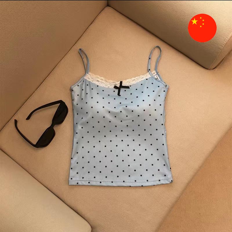 • Особенности: Легкий летний топ на тонких бретелях. Украшен узором в мелкий горошек и кружевом. В комплекте с вставками для груди.
