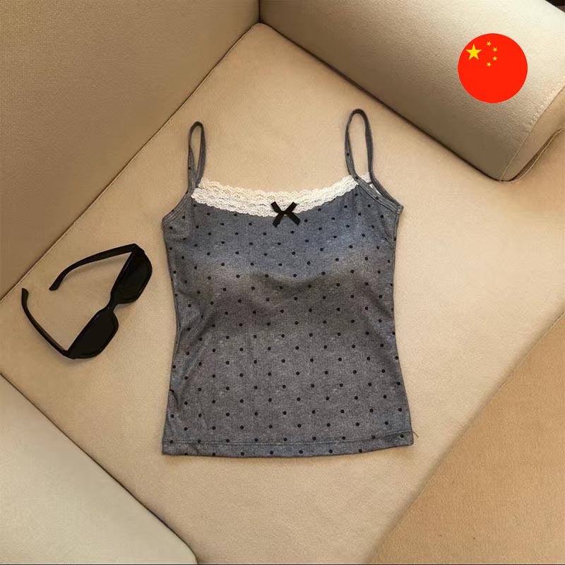 • Особенности: Легкий летний топ на тонких бретелях. Украшен узором в мелкий горошек и кружевом. В комплекте с вставками для груди.