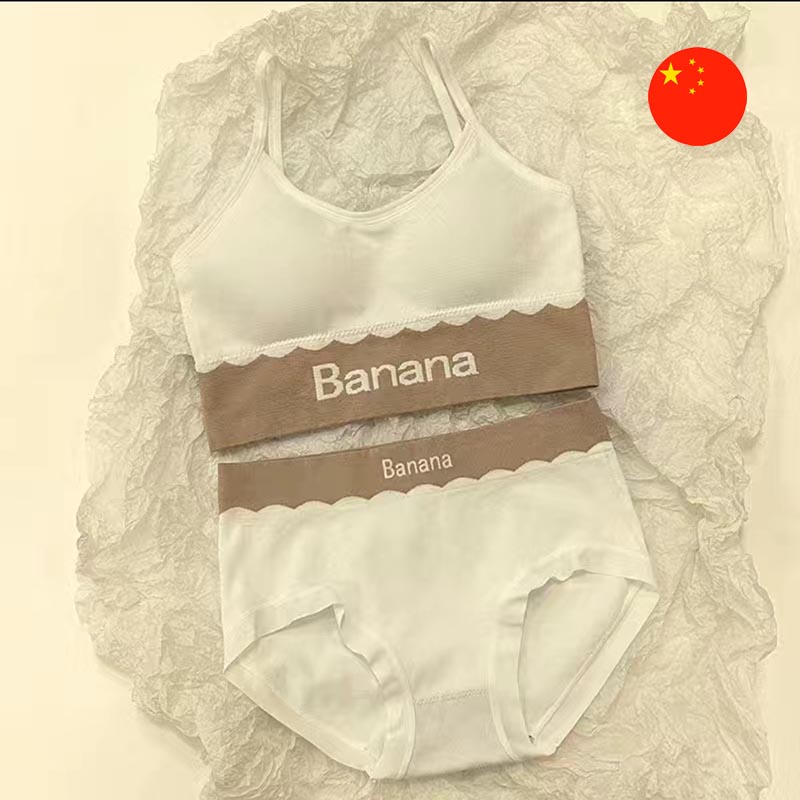 • Особенности: Комплект нижнего белья "Banana" из топа и трусиков. Белого цвета с широкой бежевой резинкой, декорированной надписью. Удобный и стильный.