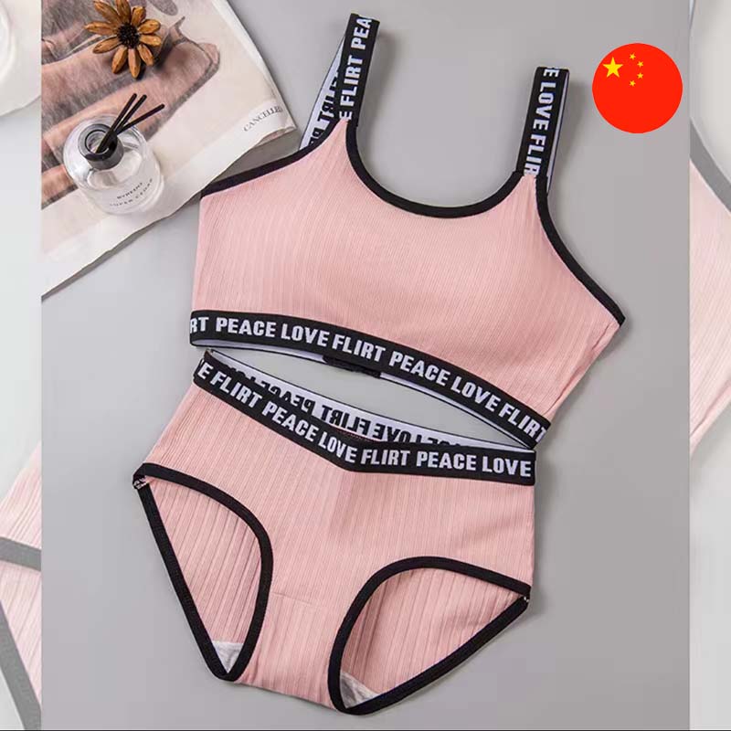 Особенности: Комплект нижнего белья из топа-бра и трусиков. Декорирован эластичными резинками с надписями "PEACE LOVE FLIRT". Спортивный и комфортный стиль.