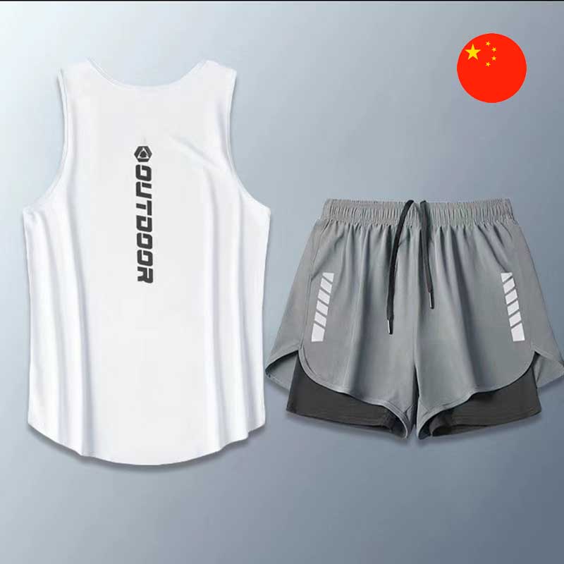 • Особенности: Мужской спортивный комплект, состоящий из майки и шорт. Майка из лёгкого материала с принтом. Шорты с двумя слоями: внутренний компрессионный и внешний свободный. Идеально подходят для занятий спортом, бега и тренировок.