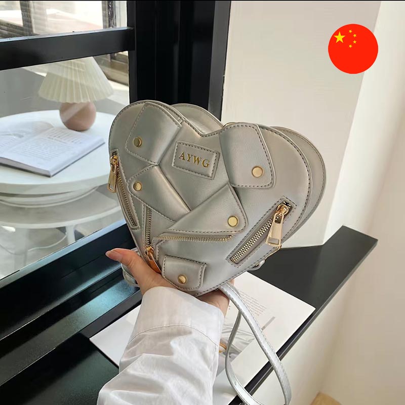 • Особенности: Оригинальная женская сумка через плечо в форме сердца. Модель выполнена из экокожи декорирована элементами, имитирующими куртку-косуху: молниями и металлическими заклепками.