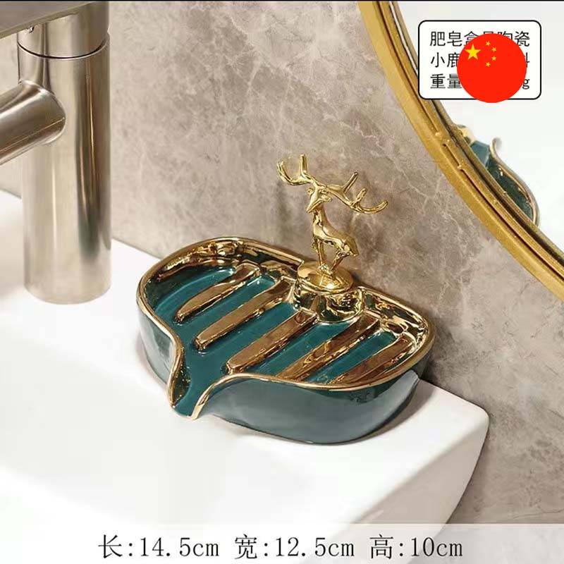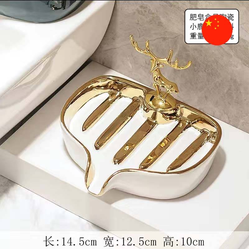 • Особенности: Оригинальная мыльница сочетает в себе функциональность и элегантность. Она выполнена из прозрачного пластика янтарного цвета и оснащена удобным сливным носиком для отвода воды. Декоративная фигурка золотого оленя добавляет изысканности.