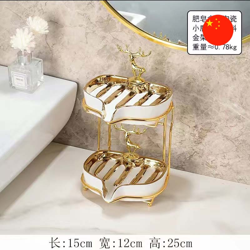 Особенности: Стильная мыльница с двойным ярусом и золотистым каркасом в виде оленей. Изготовлена из керамики с оленями из PS-пластика и каркасом из железа. Идеально подходит для хранения мыла, губок или других мелочей в ванной комнате.