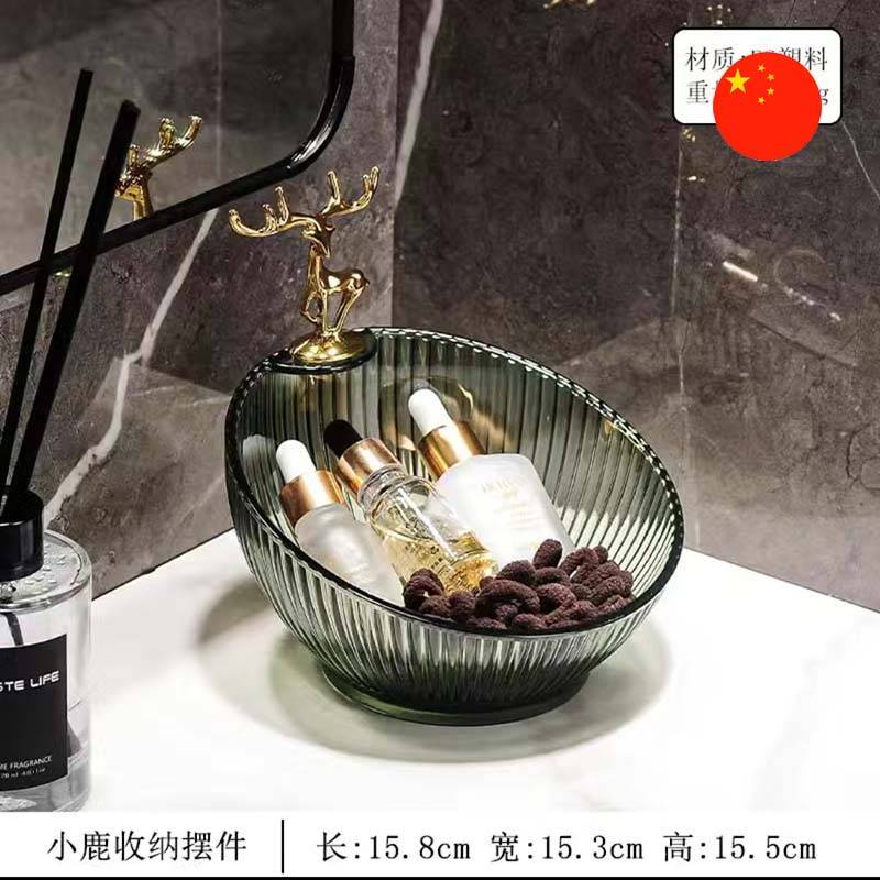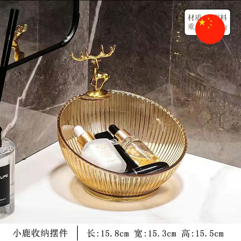 Особенности: Элегантный органайзер в виде чаши из прозрачного пластика. Украшен золотистой фигуркой оленя. Идеально подходит для хранения косметики, ювелирных украшений, ключей и других мелочей. Материал: PS-пластик.