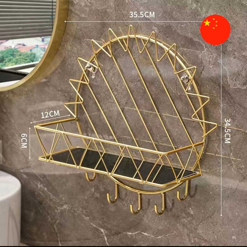 • Особенности: Настенная полка для ванную, кухню или прихожую с помощью этой стильной настенной полки. Золотистый каркас в форме солнца и чёрная полка создают элегантный и современный дизайн. Идеально подходит для хранения мелочей, косметики или ключей, а крючки позволяют удобно разместить полотенца, халаты или сумки.