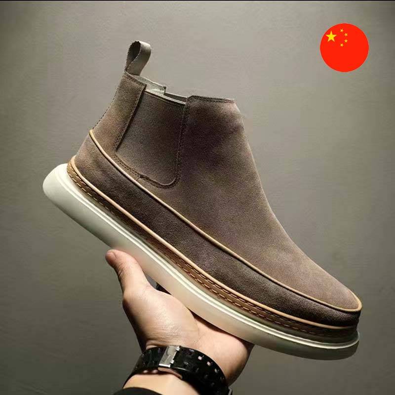 • Особенности: Мужские полуботинки сочетают элегантность и комфорт. Верх выполнен из черного матового материала замши с характерными эластичными вставками по бокам. Главный акцент массивная, легкая подошва белого цвета с контрастной коричневой полосой по ранту, которая придает обуви современный и динамичный вид.
