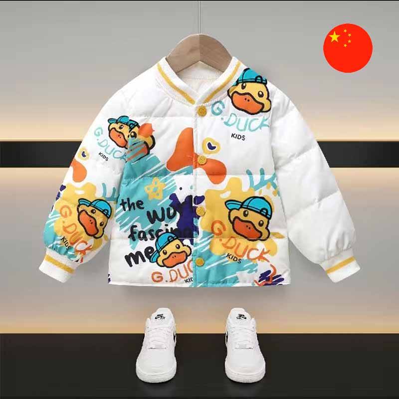Особенности: Яркая, утеплённая куртка для детей выполнена в нежном цвете и полностью покрыта крупным, забавным принтом утят. Куртка имеет классические трикотажные резинки на манжетах и поясе. Материал стёганый с утеплителем. Идеально подходит для межсезонья.