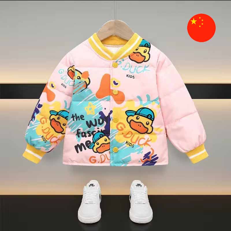 Особенности: Яркая, утеплённая куртка для детей выполнена в нежном цвете и полностью покрыта крупным, забавным принтом утят. Куртка имеет классические трикотажные резинки на манжетах и поясе. Материал стёганый с утеплителем. Идеально подходит для межсезонья.