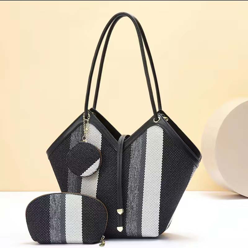 Особенности: Эта большая сумка идеально подходит для работы, покупок или пляжного отдыха. Оригинальная форма трапеции со вставками из экокожи и основной частью из прочного холщового материала в вертикальную полоску. Включает большую сумку-шоппер и съемную косметичку и клатч на молнии в том же дизайне.
