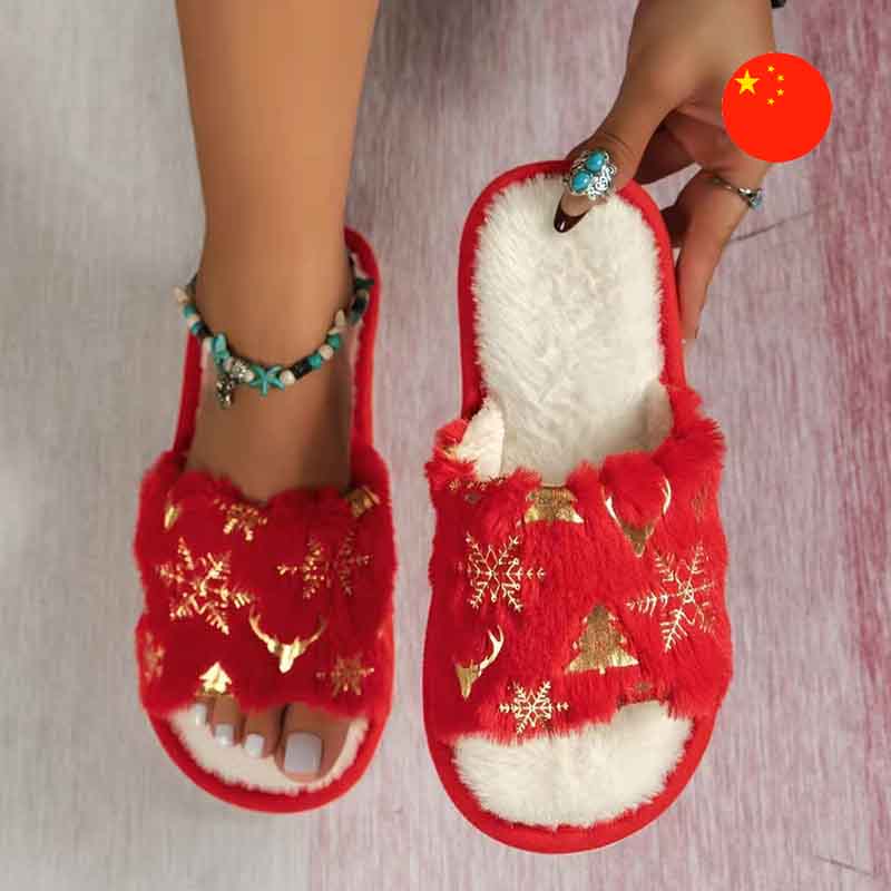 Особенности: Пушистые домашние тапочки мягкие тапочки-слайды из искусственного меха, красивогого цвета с плюшевой подкладкой. Украшены золотистым рождественским принтом. Лёгкие и очень тёплые. Идеальный выбор для зимнего сезона.