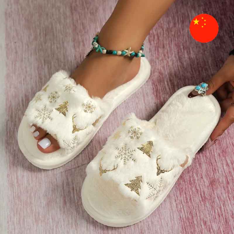 • Особенности: Пушистые домашние тапочки мягкие тапочки-слайды из искусственного меха, красивогого цвета с плюшевой подкладкой. Украшены золотистым рождественским принтом. Лёгкие и очень тёплые. Идеальный выбор для зимнего сезона.