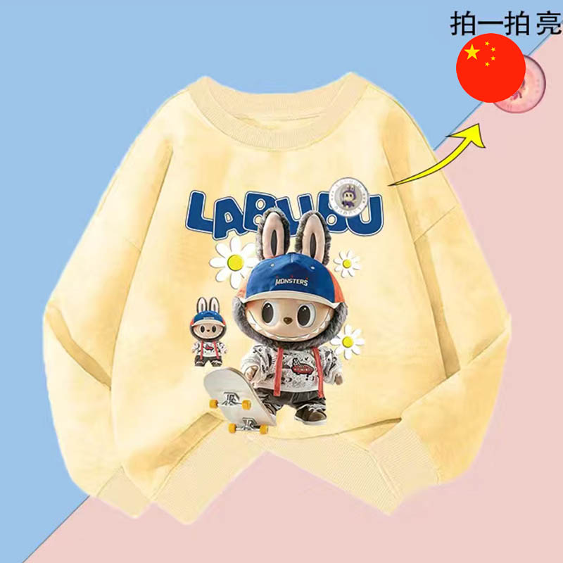 Особенности: Эта стильная детская толстовка станет ярким акцентом в гардеробе вашего ребенка. Фон подчеркивает красочный принт с изображением милых мультяшных персонажей, которые обязательно понравятся детям. На груди толстовки изображен забавный кролик в синем шлеме, а рядом с ним — его маленький друг. Надпись добавляет образу оригинальности и современности.