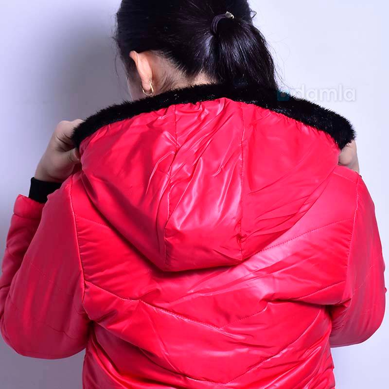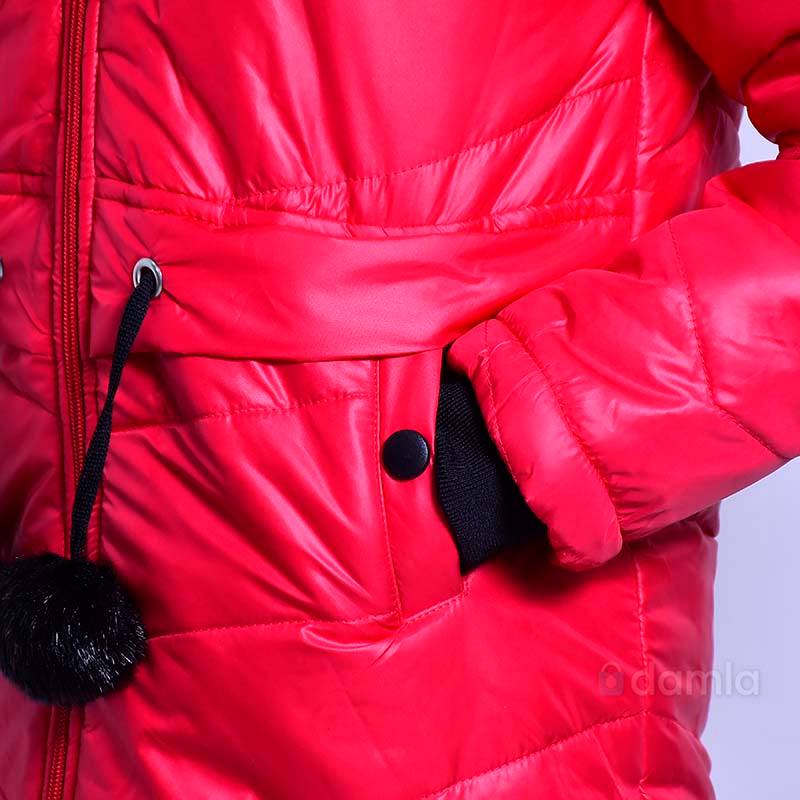 Gyz çagalar üçin gyzyl reňkli, kapuşonly, zamokly, öňi daňylýan gara reňkli ýüpli balon kurtka. Döşi "Fashion" ýazgyly we gapdalynda 2 sany jübüsi bar.