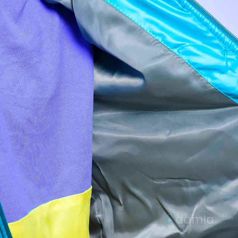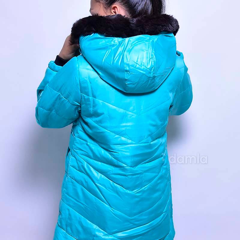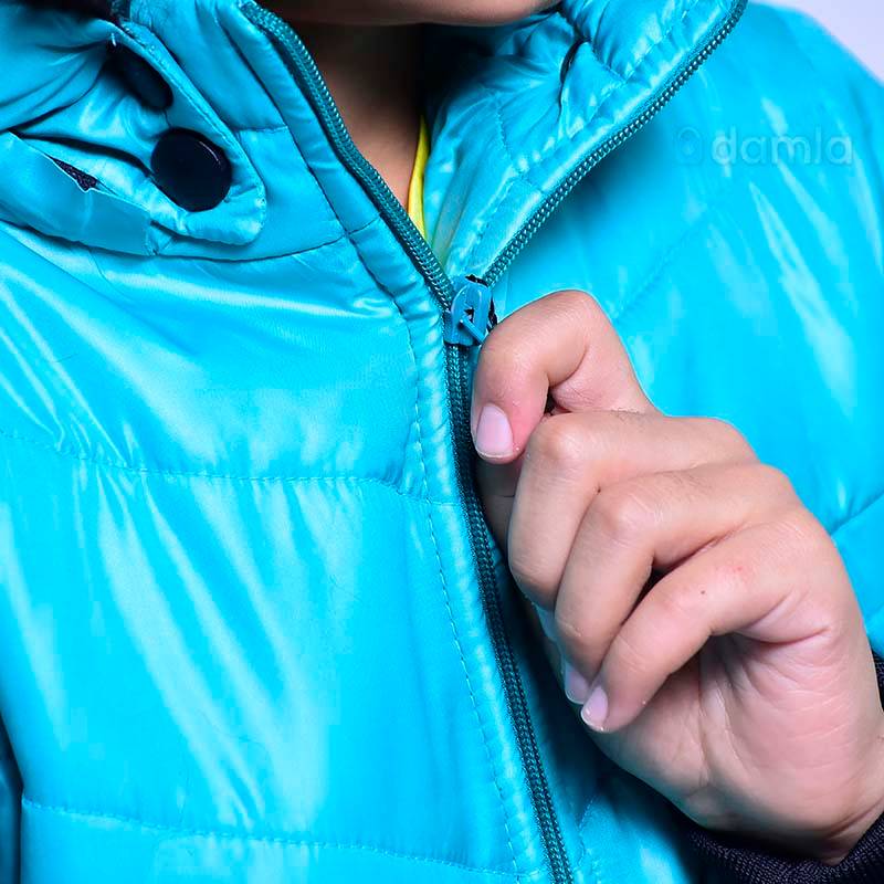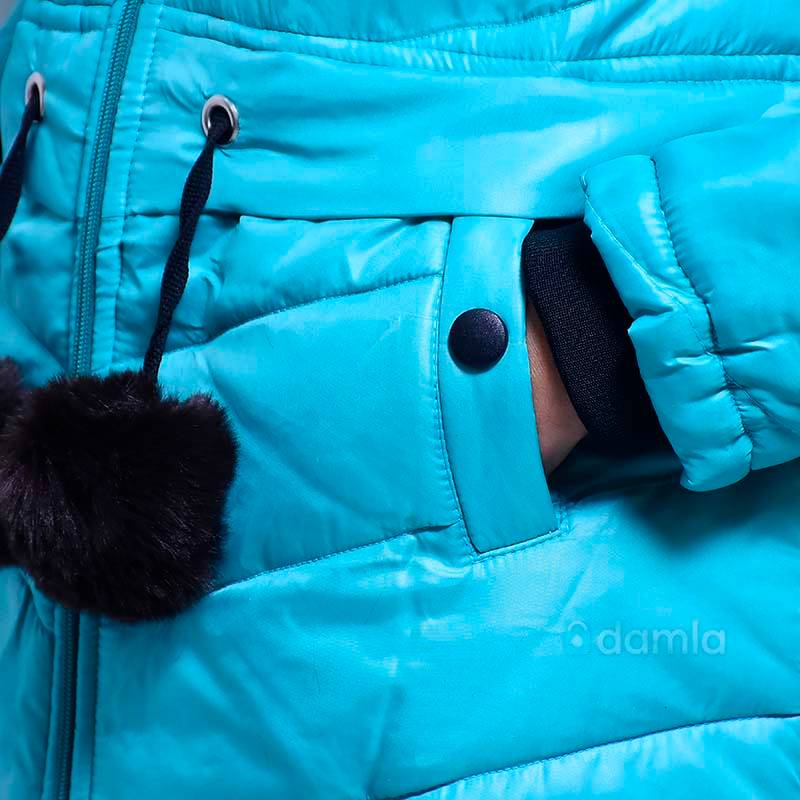 Gyz çagalar üçin açyk gök reňkli, kapuşonly, zamokly, öňi daňylýan gara reňkli ýüpli balon kurtka. Gapdalynda 2 sany jübüsi bar.