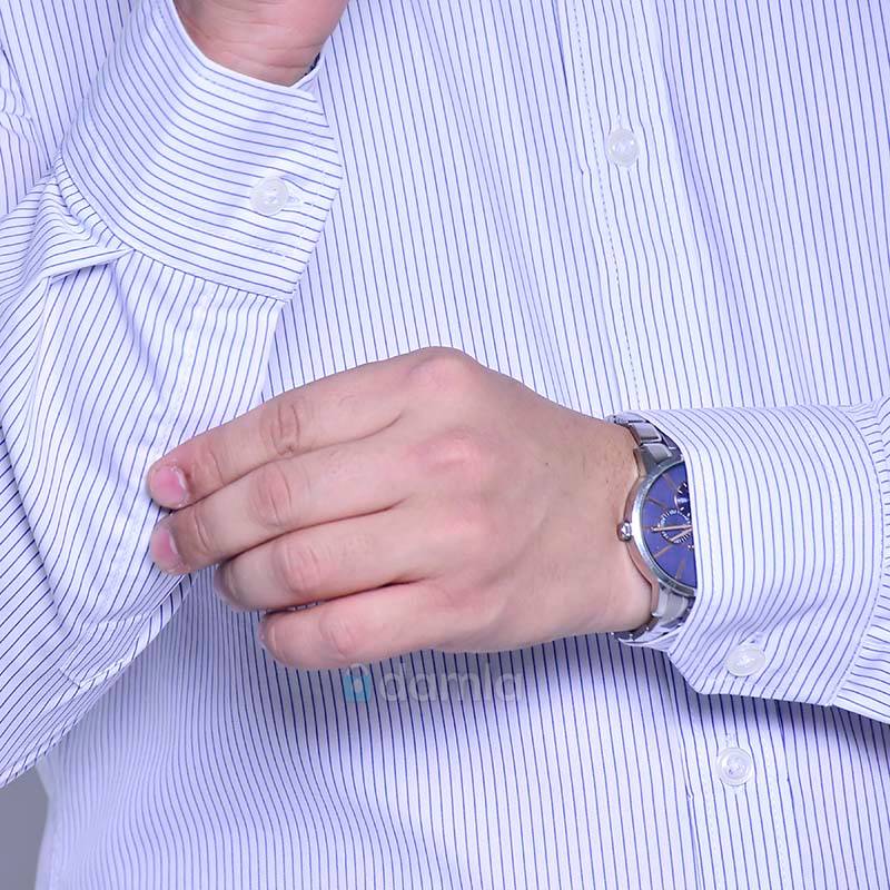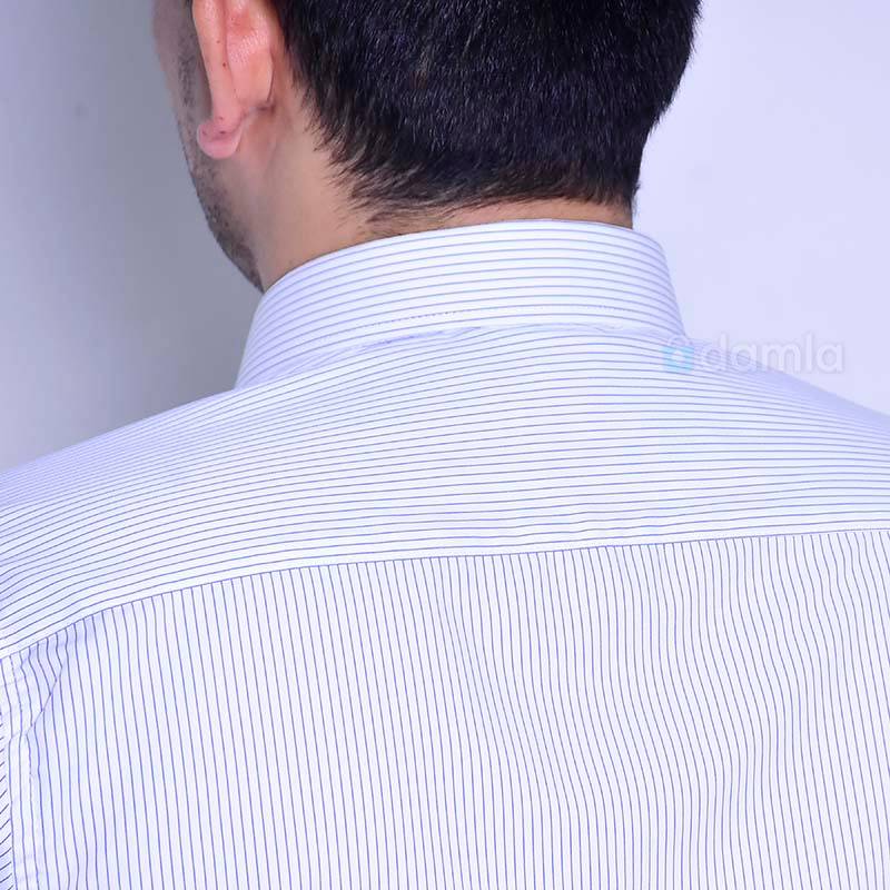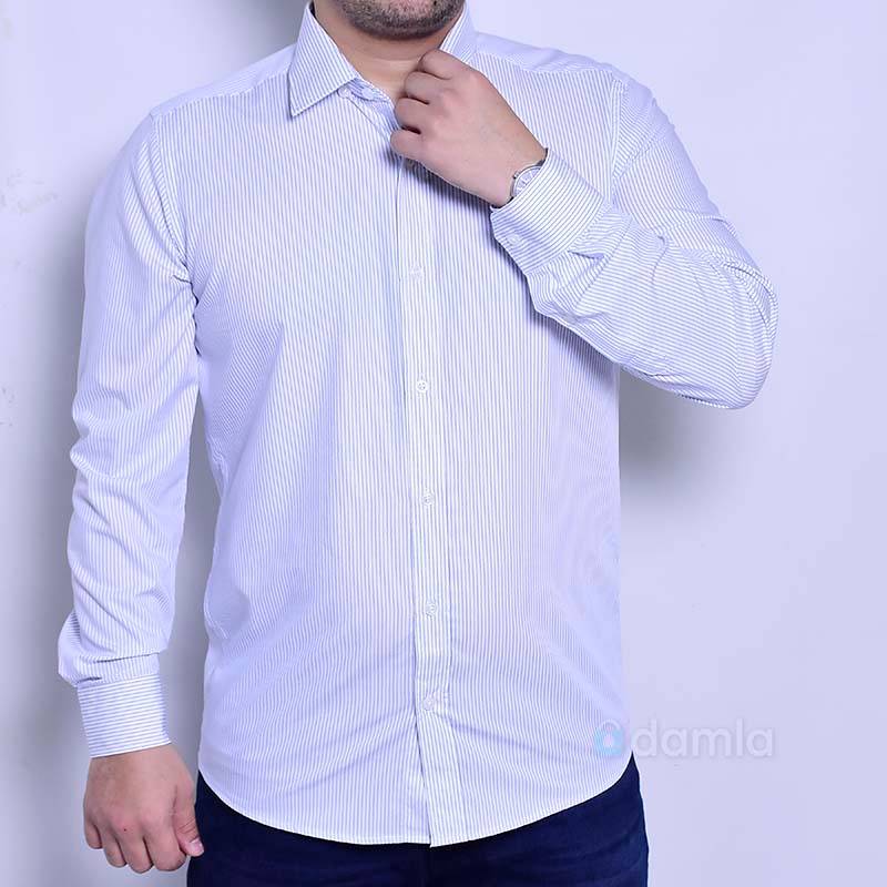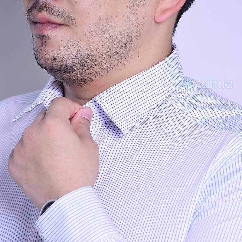 Ak reňkli, dik ýakaly, ilikli we gök reňkden çyzykly erkekler üçin köýnek. Şeýle-de gündelik geýmek üçin stilnyý köýnek.
