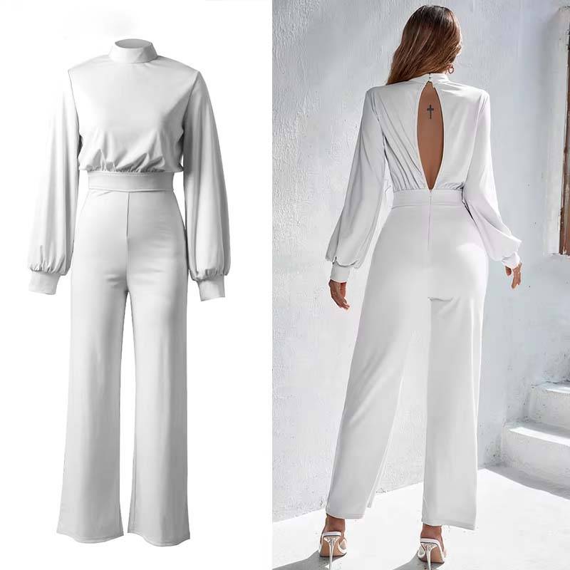 Ak reňkli arkasy dilikli stoýka ýakaly, giň balakly we uzyn ýeňli kombinezon. Süýnmeýär, kir maşyna bolýar gündelik we baýramçylyklara geýmek üçin özüne çekiji kombinezon.