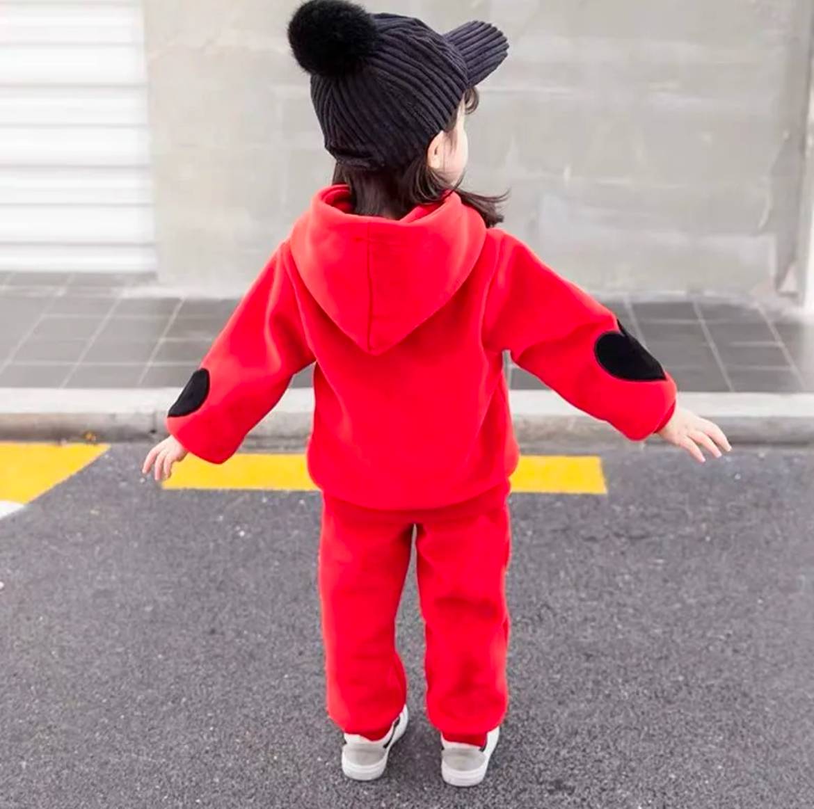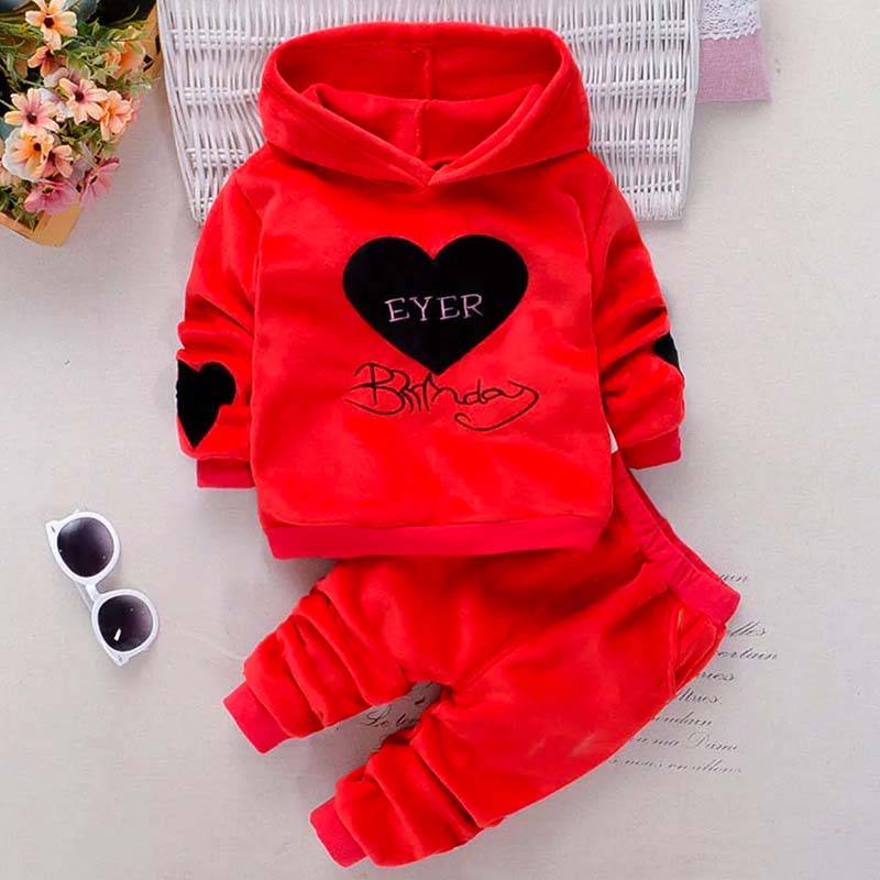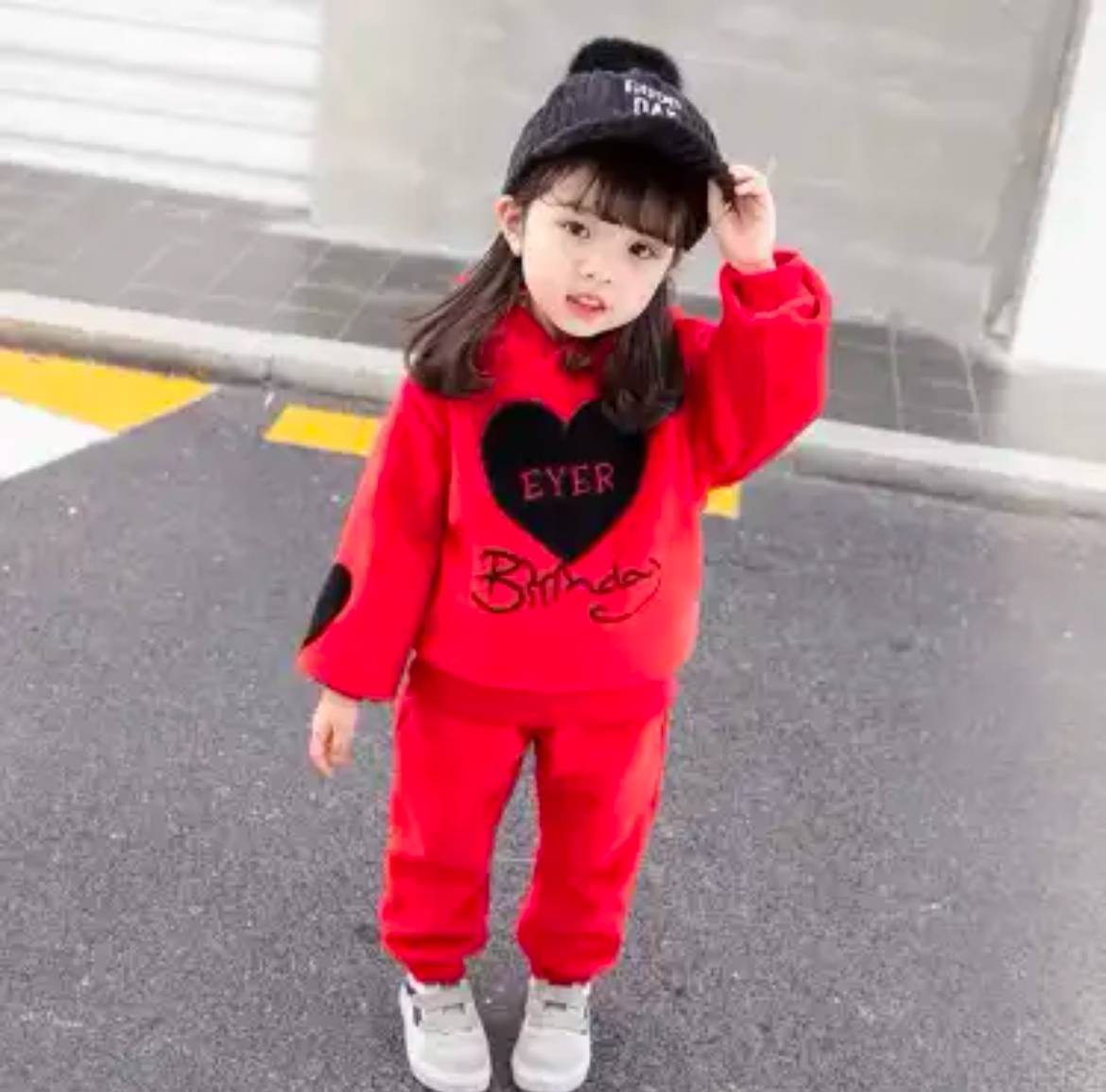 Çagalar üçin gyzyl reňkli komplekt eşik, "Ýürek" suratly, ýeňi manžetli switeri we balagy bar. Bu komplekt eşik tene ýakymly we maýyl howada gyz çagalara gündelik geýmäge bolýar.