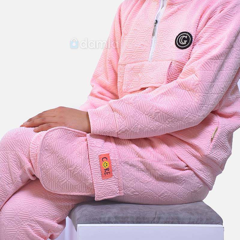 • Aýratynlyklary: Gyz çagalar üçin açyk gülgüne reňkli, owadan dizaýn fasonly, öňi kelte zamokly, ýumşak, jübüli we "G" ýazgyly komplekt ýyly eşik. Sowuk howada geýmek üçin örän gowy.